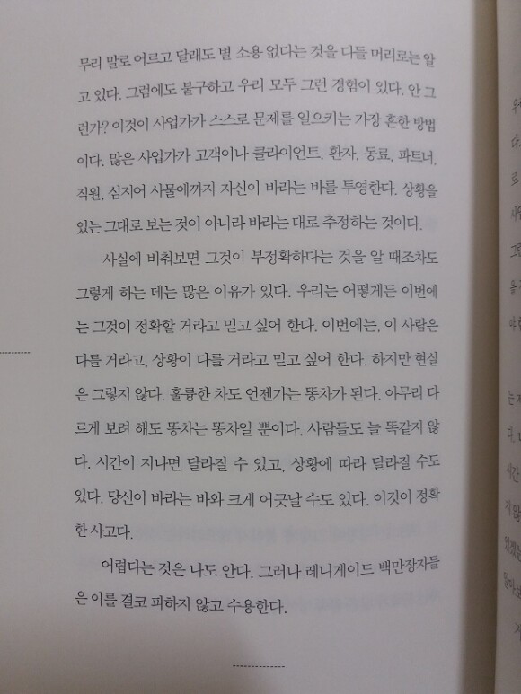 많은 사업가가 고객이나 동료, 파트너, 직원 심지어 사물에까지 자신이 바라는 바를 투영한다. 사실에 비춰보면 그것이 부정확하다는 것을 알 때조차 그렇게 하는 데는 많은 이유가 있다. 이번에는, 이 사람은 다를거라고 상황이 다를 거라고 믿고 싶어한다. p.176