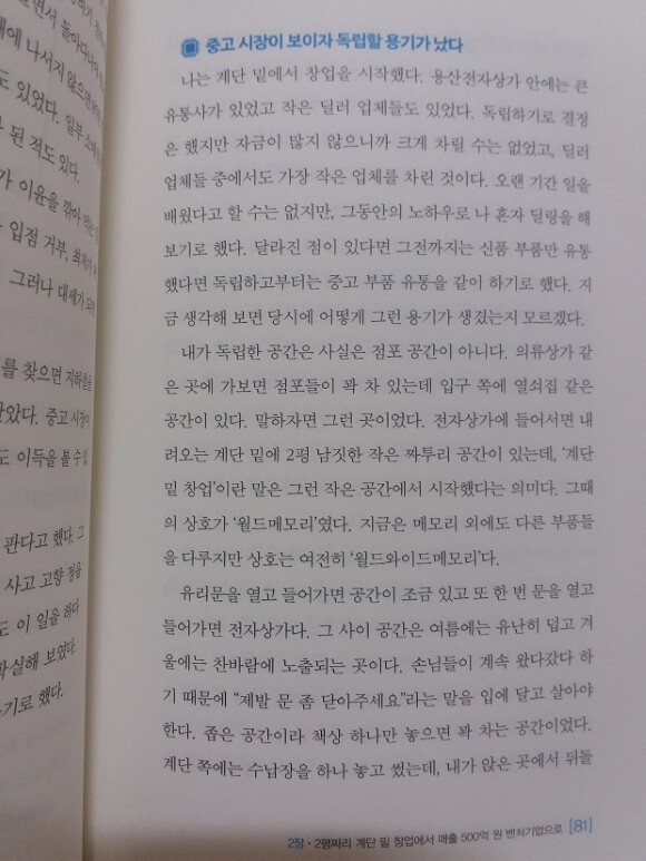 저자는 탱크도 만들 수 있다고 할 정도로 전자부품에 대해서는 없는 게 없던 용산전자상가에서 6평 가게를 열었습니다. 용산에 있는 재고는 다 내 재고다라는 마인드로 도전했다고 해요. 당시 상호는 월드메모리였고 이후 월드와이드메모리로 이름을 바꾸었어요.