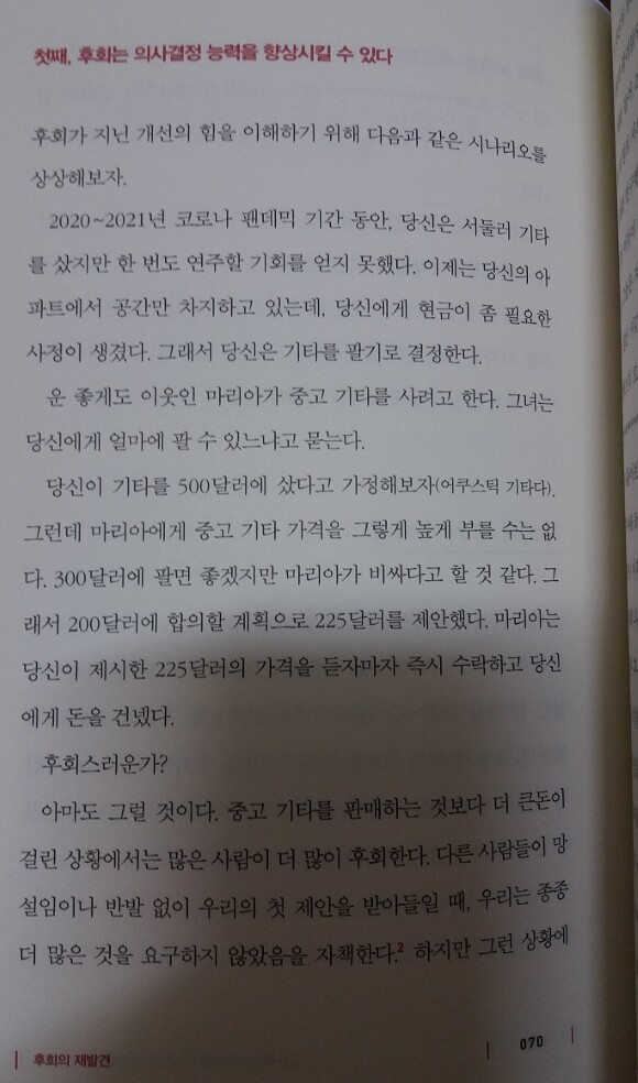 다른 사람이 망설임이나 반발 없이 우리의 첫 제안을 받아들였을 때 종종 더 많은 걸 요구하지 않을 걸 후회합니다. 자신의 후회를 인정하는 것, 후회라는 불쾌한 감정을 격퇴하기보다 불러들여 미래에 더 나은 결정을 할 수 있어요. p. 69-70