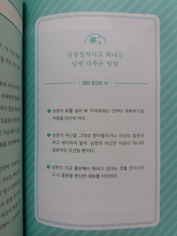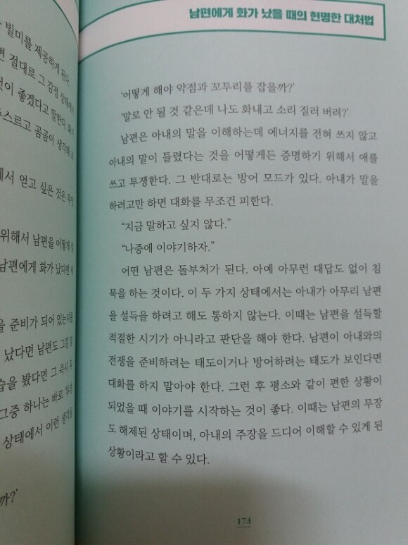 남편을 설득할 적절한 시기가 아니라고 생각하고 대화를 하지 말았다가 평소와 같은 편한 상황이 되면 이야기를 합니다.p. 174