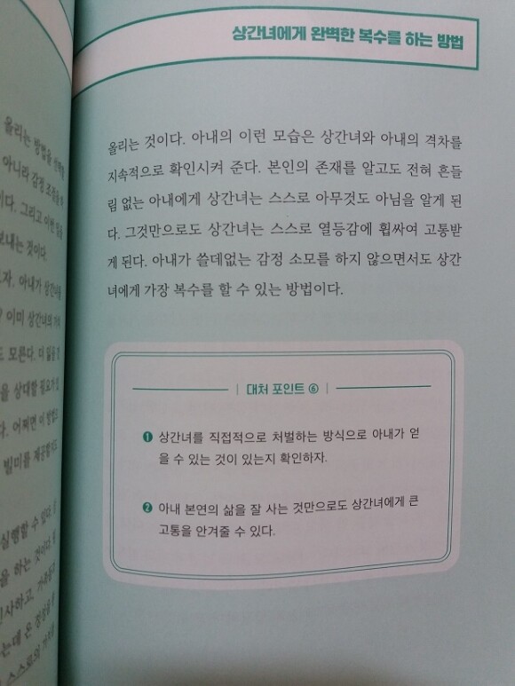 상간녀는 자신이 잘못했다고 여기거나 미안해하지 않아요. 분노에 차 복수하고 싶은 마음도 있겠지만 영화나 드라마처럼 속시원한 결말도 얻기 힘들구요. 상간녀를 이기는 방법은 행복하게 사는 거예요. 위자료 청구 등 직접적으로 처벌하는 방법이 있다면 고려해볼 수 있겠지요. p. 219