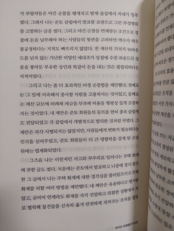 공적인 일에 관심을 갖게 되어 도시의 치안 문제를 해결하기 위해 당시 부랑자들에게 시키던 야간 순찰 대신 야경 순찰법을 제안해요. 주택 화재를 예방하고 진압할 수 있는 유니언 소방대도 결성합니다. 유니언 소방대는 50년 이상 지나 그가 자서전을 쓰는 시점까지도 왕성하게 활동했다고 해요. p.188