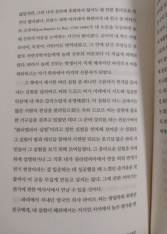 벤저민 프랭클린이 과학자로 알려지게 된 피뢰침 실험에 대해서도 말해요. 구름에서 번개를 끌어내는 실험을 성공하고 다른 과학자들이 따라 시연한 후 번개가 전기 현상이라는 것이 증명되었어요. 그는 당당하게 그에 관한 이야기는 전기에 관한 역사서에서 만날 수 있을 것이라고 썼어요. p.272