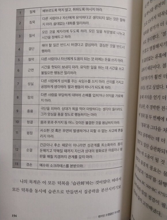 20대에는 사업가로 30대부터 과학자 40대부터는 정치가로 다양한 분야에서 성공을 거둔 역사적인 벤저민 프랭클린입니다. 작가, 시민운동가, 외교관 등 그의 명함은 수많은 직업으로 빼곡했을 거예요. 이 책은 그가 솔직하게 좋고 싫은 감정을 표현하고 비판하며 쓴 글이었어요. 그는 도덕적으로 완벽한 삶을 위해 13가지 덕목을 세웠고 습관화하기위해 노력했어요.