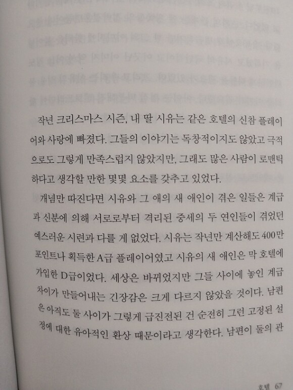 우주선이 나오는 단편 '호텔'은 게임을 배경으로 하여 짧고 코믹했어요. 호텔 플레이 속의 A급 플레이어와 D급 플레이어의 연애는 왕족과 평민 사이처럼 엄청난 반향을 일으켜요. A급 플레이어 시유의 부모는 스타 플레이어의 메인 스태프로 많은 혜택을 누렸지만 더이상은 그렇지 못하게 됩니다. 시작은 신분 차이를 이유로 한 부모와 자식간의 갈등인데 전개는 유쾌했어요. 이런식의 게임 소설도 가능하군요.