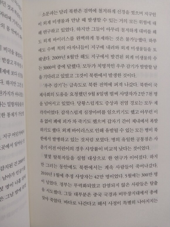 소문과는 달리 북한은 검역에 철저하게 신경을 썼으며 지구인이 외계 미생물과 만날 때 발생할 수 있는 거의 모든 위험에 대해 연구하고 있었다. 하지만 그들이 아무리 철저하게 대비를 해도 외계 바이러스를 완벽하게 통제하는 것은 불가능했다. p.147