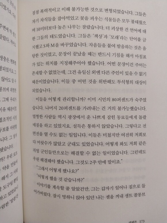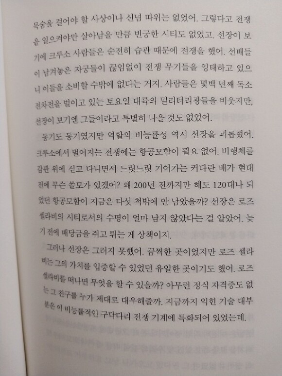 크로소 사람들에겐 목숨을 걸어야 할 사상이나 신념 따위는 없었어. 그렇다고 전쟁을 일으켜야만 살아남을 만큼 빈궁한 시티도 없었고. 선장이 보기에 크루소 사람들은 순전히 습관 때문에 전쟁을 했어. p.31