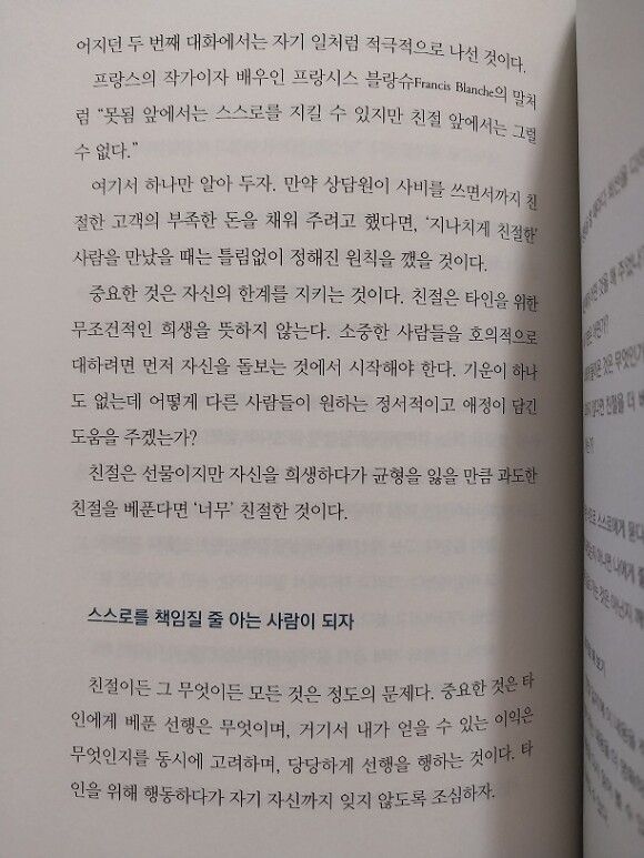 친절은 선물이지만 자신을 희생하다가 균형을 잃을 만큼 과도한 친절을 베푼다면 너무 친절한 것이다.p. 36