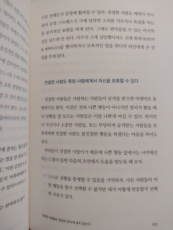 이 책에선 역설적으로 타인에게 친절하게 대하면 스트레스 수준을 낮출 수 있고 뇌도 더 활성화 된다고 합니다. 서로가 선을 지키고 배려하면 모두 평화롭게 살 수 있겠지요. 바보처럼 착하지 않고 영리하게 친절한 사람이 되는 방법을 잘 알려주네요. 착한 사람이 억울하지 않고 제대로 대접받는 세상이 되면 좋겠어요.