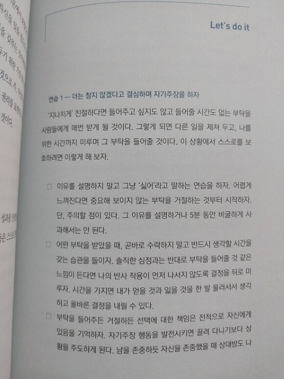 구체적인 행동을 연습하는 방법을 알려주고 실천 방향도 제시합니다. 곤란한 부탁을 받게 되면 나를 보호하기 위해서 이런 방법을 써봐요.