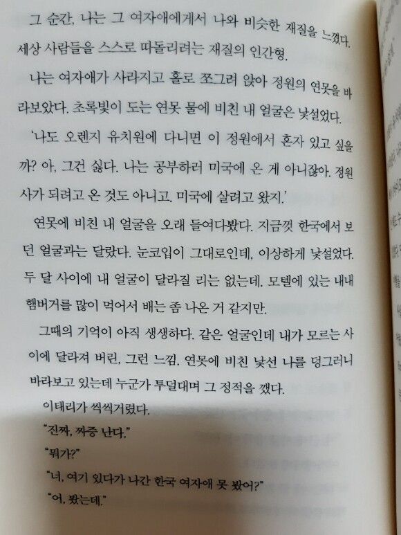 나는 여자애가 사라지고 홀로 쪼그리고 앉아 정원의 연못을 바라보았다. 초록빛이 도는 연못 물에 비친 내 얼굴은 낯설었다. p. 54