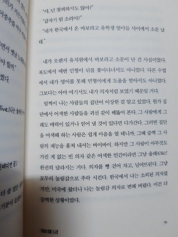 한국에서 나는 소외된 의자였지만 미국에 왔더니 나는 놀림감 의자로 변해 버렸다. 이건 더 끔찍한 상황이었다. p.79