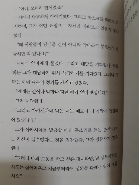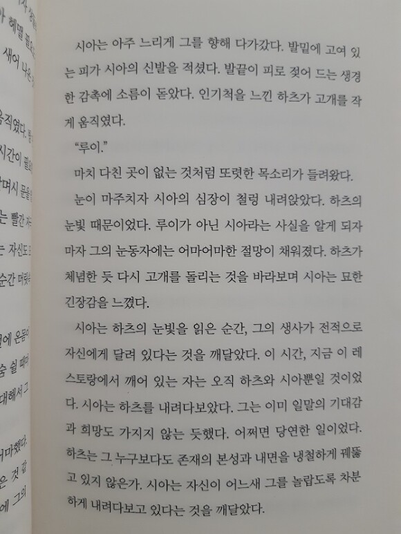 시아는 하츠를 내려다보았다. 그는 이미 일말의 기대감과 희망도 가지지 않는 듯했다. 어쩌면 당연한 일이었다.하츠는 그 누구보다도 존재의 본성과 내면을 냉철하게 꿰뚫고 있지 않은가. p.105