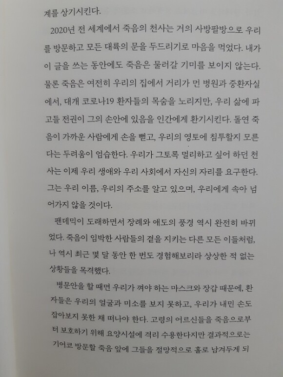 고령의 어르신들을 죽음으로부터 보호하기 위해 요양시설에 격리 수용한다지만 결과적으로는 기어코 방문할 죽음 앞에 그들을 절망적으로 홀로 남겨두게 되었다. 장례식을 비공개로 진행하고 조문객 수를 제한하여 애도자들에게 포옹을 하거나 악수를 할 수도 없었다. 이 모든 일들을 우리는 경험해야 했고 이에 대한 판단은 나중으로 미룰 수밖에 없다고 생각했다.p.17