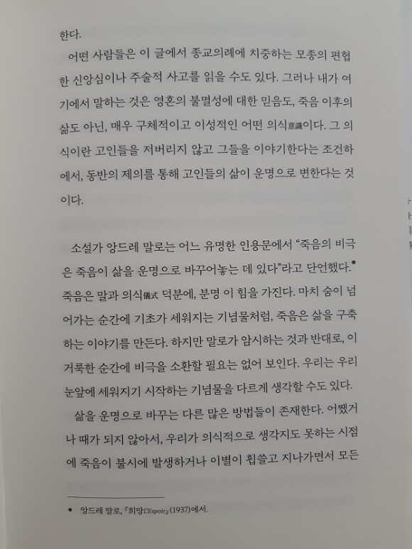 숨이 넘어가는 순간에 기초가 세워지는 기념물처럼 죽음은 삶을 구축하는 이야기를 만든다. 하지만 이 거룩한 순간에 비극을 소환할 필요는 없어 보인다. p.55