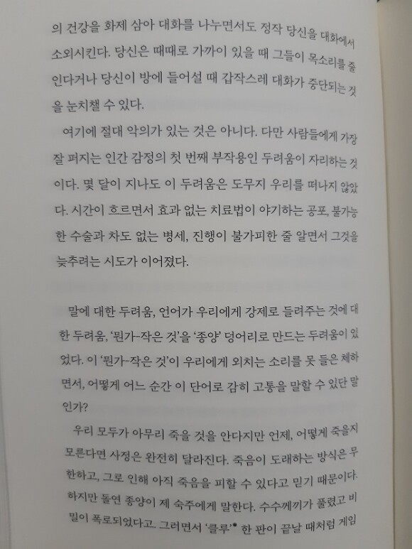 돌연 죽음이 가까운 사람에게 손을 뻗고 우리의 영토에 침투할지 모른다는 두려움이 엄습한다.