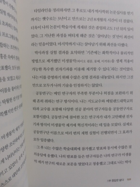 타임라인을 정리하자면 그 후로도 내가 박사학위 논문 심사를 받기까지는 햇수로는 3년이고 만으로는 2년8개월의 시간이 더 걸렸다. 그 지난한 과정을 버티게 해준 것은 살아남는 것만이 최선이라는 믿음이었다. 마지막까지 나는 살아남기 위해 최선을 다했다. P.109