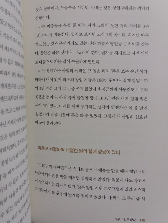 나는 마중물을 부을 줄 아는 자와 그렇지 못한 자의 차이를 0과 0에 비유한다. 숫자로 보자면 고작 1의 차이다. 아무것도 없는 것과 무언가라도 있는 것은 하늘과 땅만큼 큰 차이를 갖는다. 창업은 하는 것이다. 저질러야 한다. 뭔가를 저지르고 나면 의외로 다음으로 가는 길이 수월하게 열린다.P.195