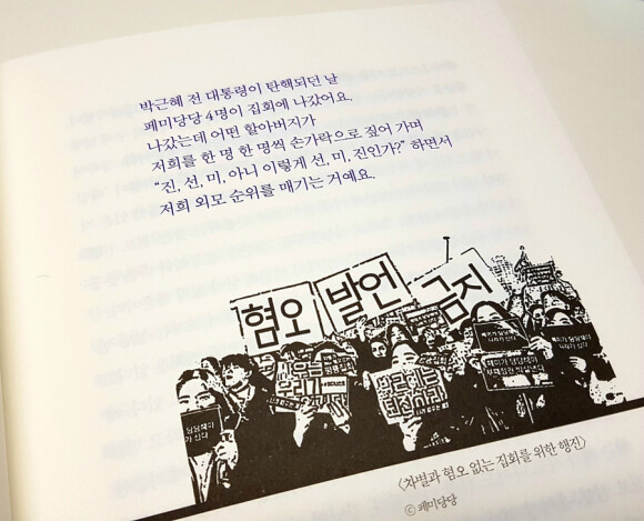 '뒤늦은 알아차림'이 없는 세상이 되었으면 좋겠다. 이 구절은 페미니스트의 애타는 마음과 더불어 어렵게만 느껴지던 페미니즘이 친숙하게 확 와닿는 순간이었다. '여자가 어디서...', '여자 주제에...'가 아닌 같은 인간으로서 동등하게 대우받고 이런 활동이 별난 개성이 아닌 당당한 권리를 주장하는 것임을 그리고 더는 불안이 대물림되지 않고 여성이기 이전에 '나'라는 존재로 온전히 살아갈 수 있는 세상이 되기를 그들은 꿈꾼다. 이유 없는 분노와 헛된 트집이 아닌 페미니스트의 이런 움직임. 우리 조금만 더 마음을 열고 서로를 이해하며 존중해주면 어떨까? 역차별은 원하지 않기에 남녀가 서로 존중하며 함께 나아갈 수 있는 다음 세상을 꿈꿔본다. 책을 덮자 아까 만났던 표지의 '센 언니들'이 다시 보인다. 굵다고 생각했던 다리가 이제는 튼튼하게, 별로라고 생각했던 이미지는 듬직하고 멋지게, 예쁘지 않다고 생각했던 외모는 세련되고 개성 있게 느껴지는 걸 보니 내 마음에도 어떤 동요가 이는 모양이다. 소신껏 활동하는 그대들이 원하는 세상이 오기를 이 소심한 여인이 응원합니다!