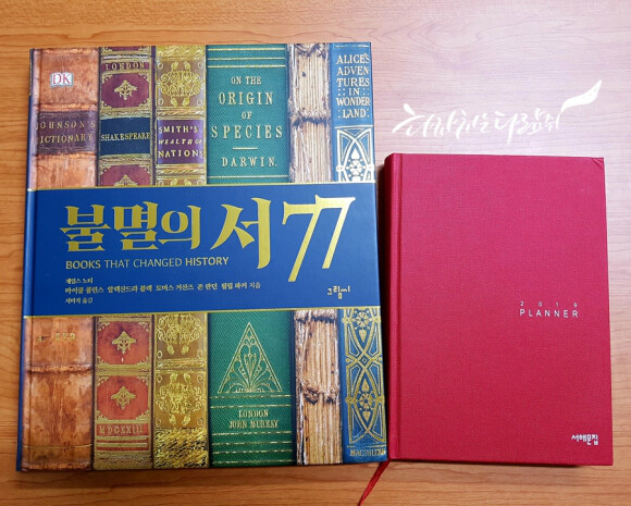 책을 좋아하는 사람이라면 아마 누구나 관심을 가질 책의 역사. 밤늦도록 책을 뒤적이다 문득 이 책이란 존재는 어떻게 탄생할 걸까 궁금했던 적 없으신지? 난 종이의 발명과 필사 그리고 인쇄술까지 이렇게 오롯이 내 손 안에 들어온 책 한 권을 만든 그 역사의 발자취가 늘 궁금했다. 인간은 어떻게 '기록'이란 걸 하기 시작했고 죽기 전에 꼭 알아야 할 대단한 책들은 몇 권이나 될까? 검색하거나 관련 서적도 찾아 읽었지만, 그 갈증은 시원하게 가시지 않고 늘 목과 가슴 언저리에 남아 이따금 나를 괴롭혔다. 그러던 중 드디어 만난 위대한 책, 『불멸의 서 77』. 이 책을 만나려고 나는 그 오랜 세월을 방황했나 보다. 일단 책을 받고 그 크기에 놀랐다. 이 웅장한 크기를 사진에 어떻게든 표현하고 싶었는데, 시중 다이어리 중 꽤 큰 편에 속하는 빨간 다이어리와 함께 두어도 사진으로는 크기를 가늠하기 어려운 것 같아 아쉽다. 이 책의 크기는 가로 26cm, 세로 31cm, 두께는 2.2cm! 올컬러 양장본으로 고화질 사진 자료가 다수 실려 있어 보는 즐거움이 상당하다. 자, 그럼 『불멸의 서 77』에 대해 좀 더 알아보자.
