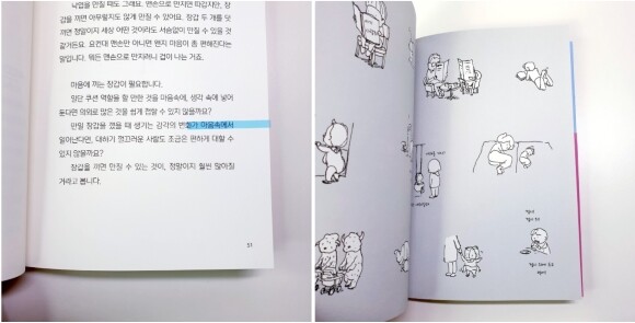 중립적인 입장에 있는 누군가가 서로의 고마움을 일깨워준다면, 세상일이 훨씬 수월하지 않을까 싶다는 작가. 그럼 그 고마움 알리미 담당자의 보수는 누가 지불할까? 그건 자기도 모른단다. 풉. 아내에게 콕 찍어 지적하고 싶은 점이 있지만, 후환이 두려우니 우주인이 대신 말해줬으면 좋겠다니... (내 남편이었으면 가만두지 않았을 거다.) 모든 사이트 첫 화면에 이런 인증창이 뜨면 어떨까? '당신은 착한 사람입니까?' 그럼 악성 댓글은 없어질 거라는 순진무구한 상상력에 슬그머니 작가의 편을 들어주고 싶다. 어쩜 이리 아이처럼 마음의 때가 없을까? 하지만 지나친 감동은 근물! 마음이 촉촉 훈훈해지려는 찰나면 여지없이 개그감 충만한 훅이 날아든다. '생각은 곧 방귀'라고 진지하게 말하는데, 친한 친구면 이걸 때려야 하나, 말아야 하나 심각하게 고민했을 듯. 에세이라며 스케치를 넣기 난감해하는 출판사를 설득하여 각 장 끝에 무작위로 스케치만 나열한 페이지는 신의 한 수였다. 귀여운 그림 위에 쓰여 있는 엉뚱한 한 마디란... 이걸 어떻게 설명해야 하나. 배꼽 빠지게 미친 듯이 재밌는 건 아닌데... 상당히 재밌다. 직접 읽어 봐야만 알 수 있는 4차원의 진지함. 진지해서 더 웃긴... 아, 제발 꼭 읽어 보세요!