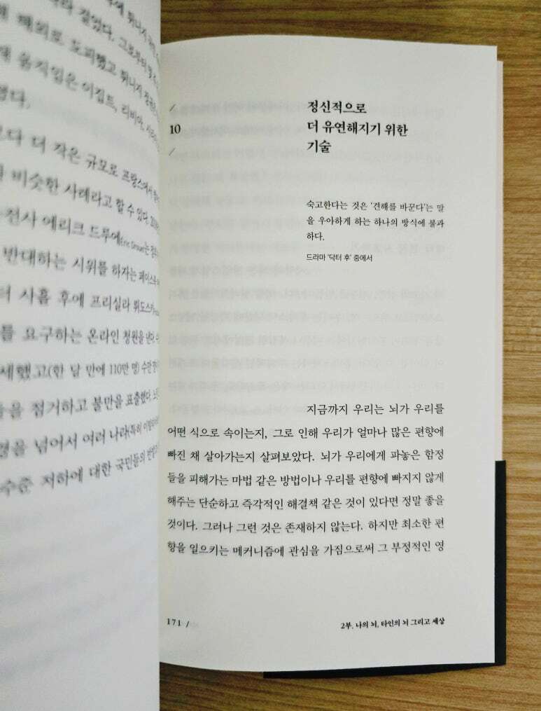 그럼에도 저자는 뇌의 한계를 이유로 책임을 회피하라고 말하지 않습니다. 오히려 자신의 뇌가 어떤 습관적 왜곡을 가지고 있는지 이해할수록, 더 나은 선택을 할 수 있다는 메시지를 계속해서 강조합니다. 뇌를 ‘통제해야 할 문제적 존재’가 아니라, 이해하고 조율해서 ‘내 편으로 만들어야 할 파트너’로 바라보게 만드는 점이 이 책의 가장 큰 미덕이라고 느꼈습니다. 뇌를 적으로 돌리는 순간 자기혐오와 체념으로 빠져들기 쉽지만, 뇌를 동료로 대할 때 비로소 변화의 가능성이 열린다는 통찰은 큰 울림을 주었습니다.