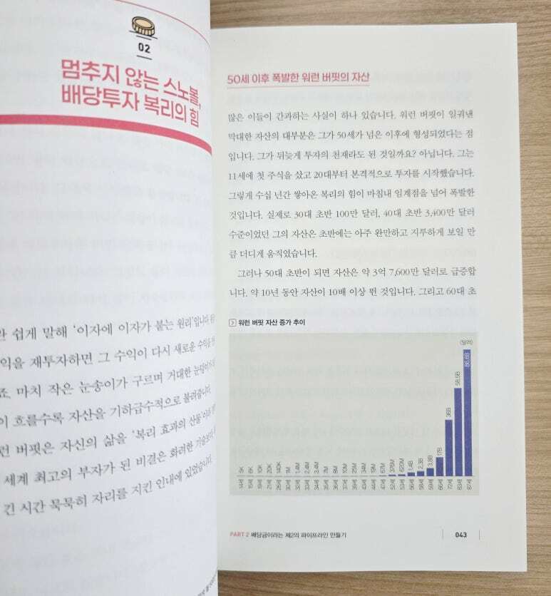 책에서 가장 인상 깊었던 개념은 '창고형 인생'과 '우물형 인생'의 비유였습니다. 월급을 받아 저축하고 소비하는 방식은 창고에 물건을 쌓는 것과 같습니다. 언젠가 창고가 비면 끝입니다. 반면 배당 투자는 마르지 않는 우물을 파는 일입니다. 한 번 완성된 우물은 계속해서 물을 내어 줍니다. 저자가 필명을 '배당의만장'으로 정한 것도 연간 배당으로 만 원권 지폐 1만 장을 받겠다는 구체적인 목표에서 비롯되었다고 합니다. 추상적인 경제적 자유가 아니라 숫자로 환산된 목표치를 제시한다는 점이 현실적이고 실행 가능하게 느껴졌습니다.