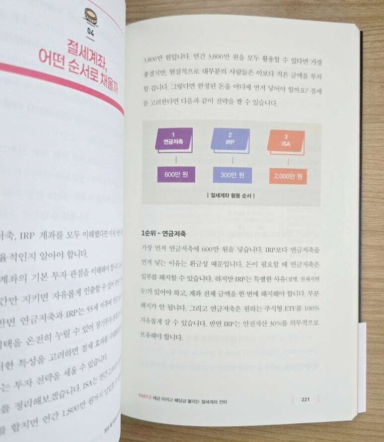 절세 전략을 다룬 부분도 이 책이 다른 투자서와 구별되는 지점이었습니다. ISA, 연금저축, IRP 세 계좌를 어떤 순서로 채우고, 어떤 종목을 어느 계좌에 담아야 세금을 최소화하면서 수익을 극대화할 수 있는지를 단계별로 안내합니다. 수익을 올리는 것만큼 세금을 아끼는 것이 실질 수익률에 큰 영향을 준다는 점을 많은 투자자들이 간과하는데, 이 책은 그 부분을 꼼꼼하게 짚어줍니다.