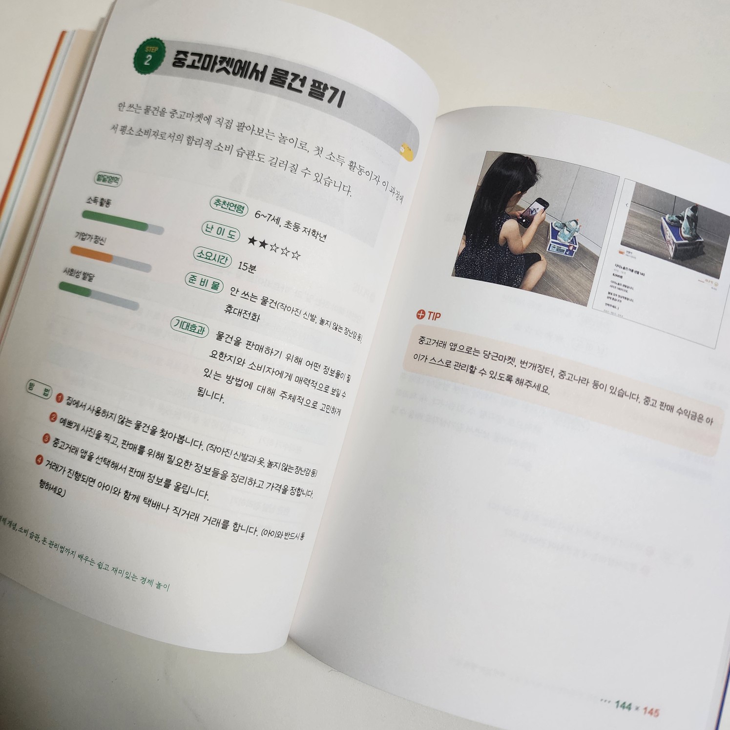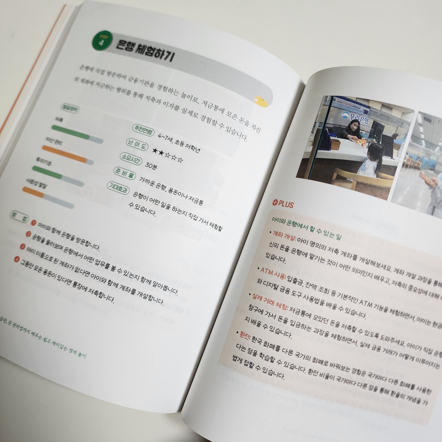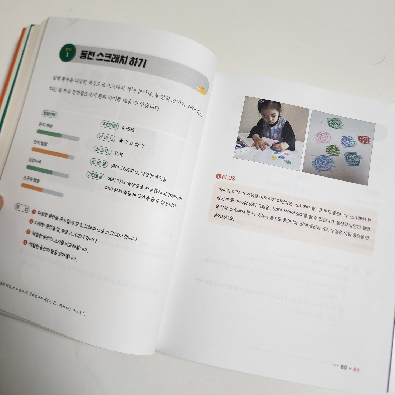 이책에서는 돈이 무엇인지 돈에 대해 탐구할수있는 간단한 놀이부터 마드 셀프 계산대에서 계산해보는거나 내가쓴돈을 적어보는 돈을 어떻게 사용하는지 알아보는 다양한 놀이들이 담겨져 있어요 마지막으로 돈을 어떻게 관리해야할지까지 아이들이 할수있는 재미있는 놀이들로 자연스럽게 활동해 볼수있게 가르쳐 주고 있어서 많은 도움을 받았어요.