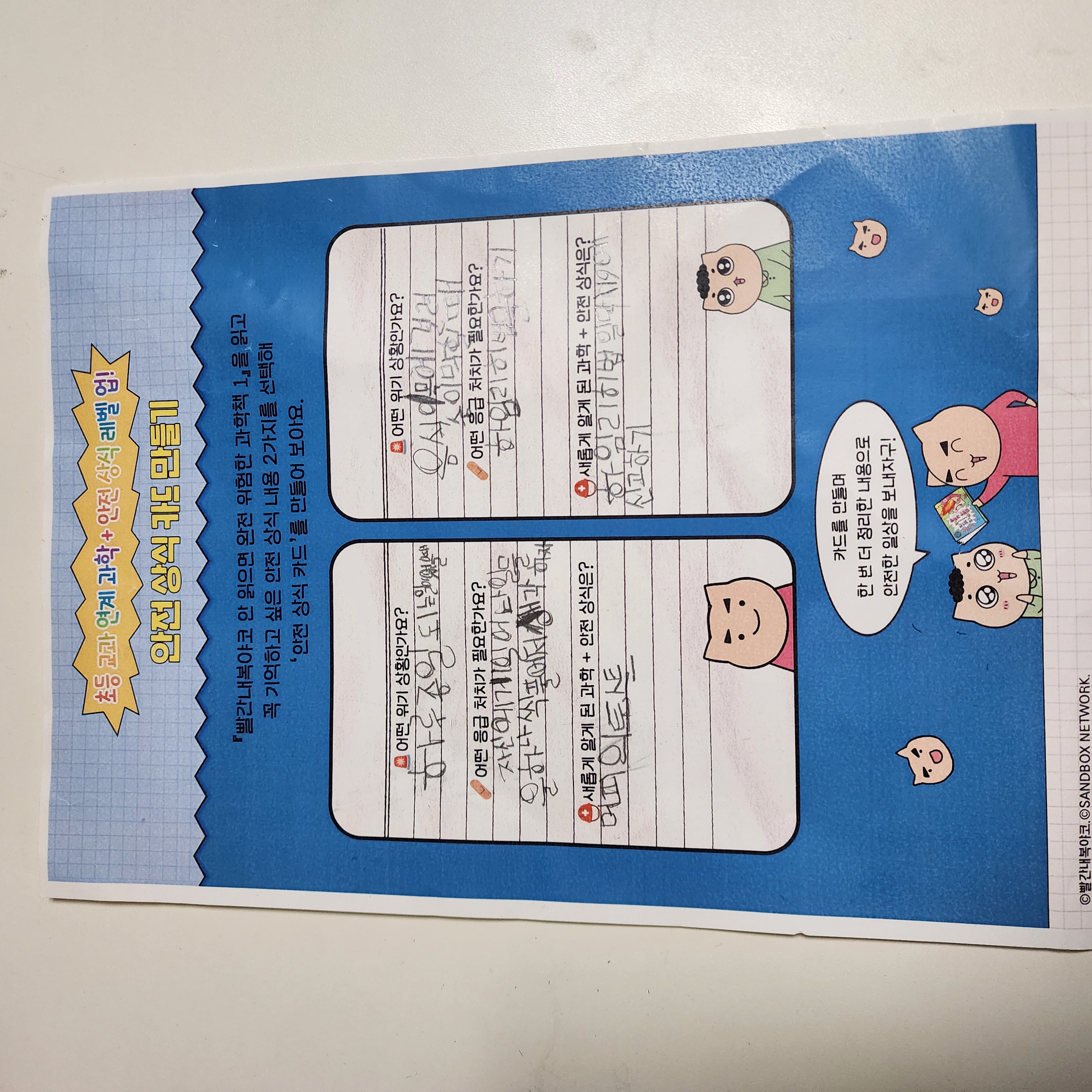 안전상식카트를 만들어 보기인데 아직 1학년이라 어설프지만 읽었던 내용중에 가장 인상깊었던 내용을 다시 한번 이야기 해 볼수있어서 좋았습니다.