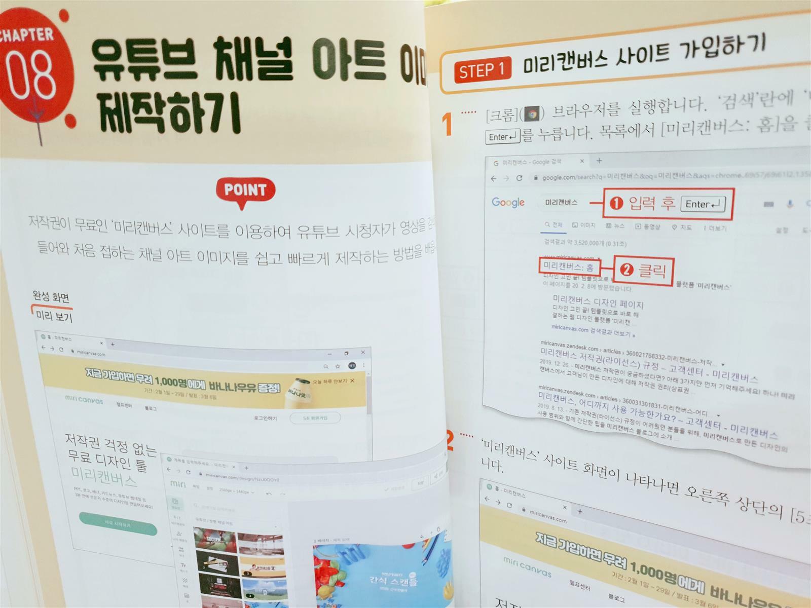 유튜브 영상을 검색하는 방법도 알려 준다. 특히 필터 기능, 키워드 검색, 크리에이터 커먼즈를 이용 저작권 무료 영상 검색까지 상세히 알려준다. 저작권이 무엇인지 짚어주는 부분도 있다. 처음 유튜브를 시작하는데 저작권 개념이 아직 없는 이들에게는 꼭 필요한 내용이었다. 그리고 저작권 무료인 미리캔버스를 이용해 채널 아트 이미지를 쉽고 빠르게 제작하는 방법도 알려주고 있다. 은근히 어려운 부분을 쉽게 알려주는 것이 이 책의 특징이다.
