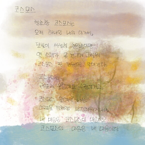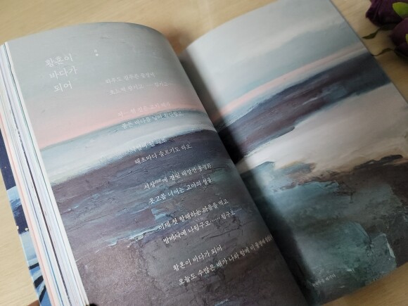 요즘 황혼이라는 단어에 꽂혀있다보니 '황혼이 바다가 되어' 이 시도 눈에 들어왔다. 특히 배경의 그림이 어디가 바다고 어디가 하늘인지 경계도 흐려지는 느낌이 마음에 들었다.