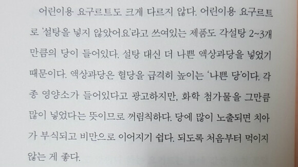 이외에도 아이가 많이 즐겨 마시는 요구르트는 요구르트 개당 각설탕 3개와 각종 첨가물, 방부제, 유화제 등을 섞은 설탕물과 가깝다고 얘기한다