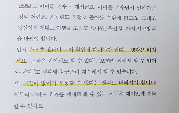 우리는 매번 스포츠센터나 요가학원에 다녀야만 제대로운동을 할 수 있다 생각하지만 그 생각을 완전히 뒤집어 집에서만이 운동을 할 수 있다고 말이다