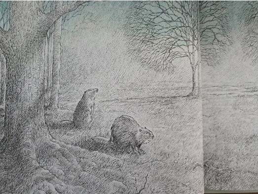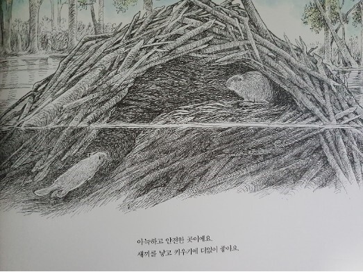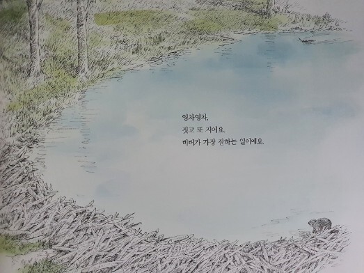 이번에는 연둣빛 잎을 물고잇는 비버의 모습이 눈에 띄네요.
