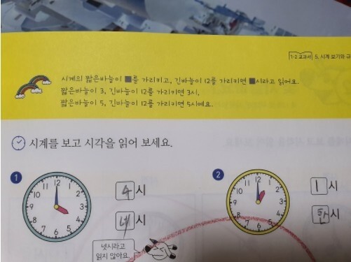 긴바늘이 12를 가르키면 몇 시인지부터 예요.