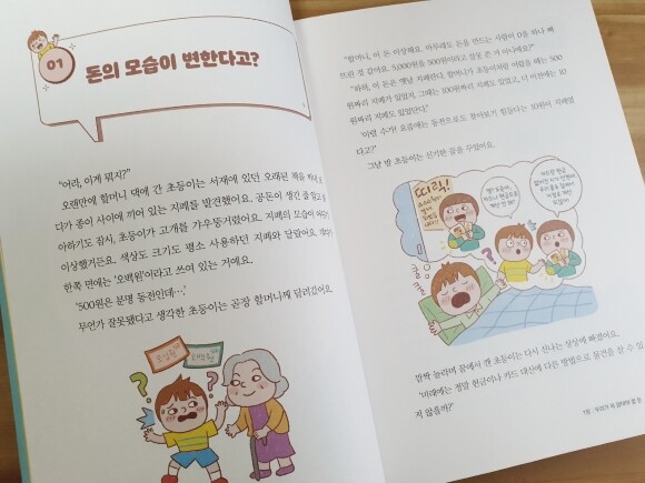 초등이가 옛날 종이돈 오백원을 보면서 이야기를 시작해요.