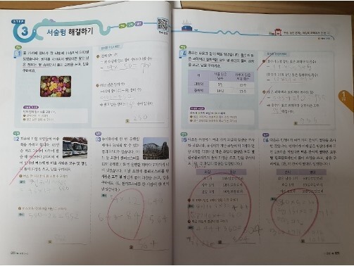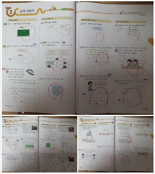받아올림을 한다고 써놓고 정작 답에서 더하기를 안해 틀리는 경우가 적지않았어요.