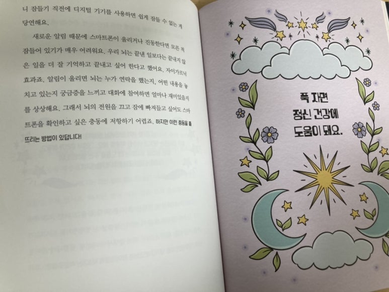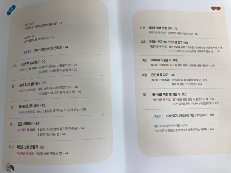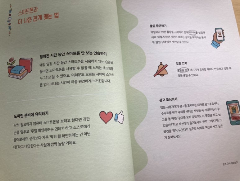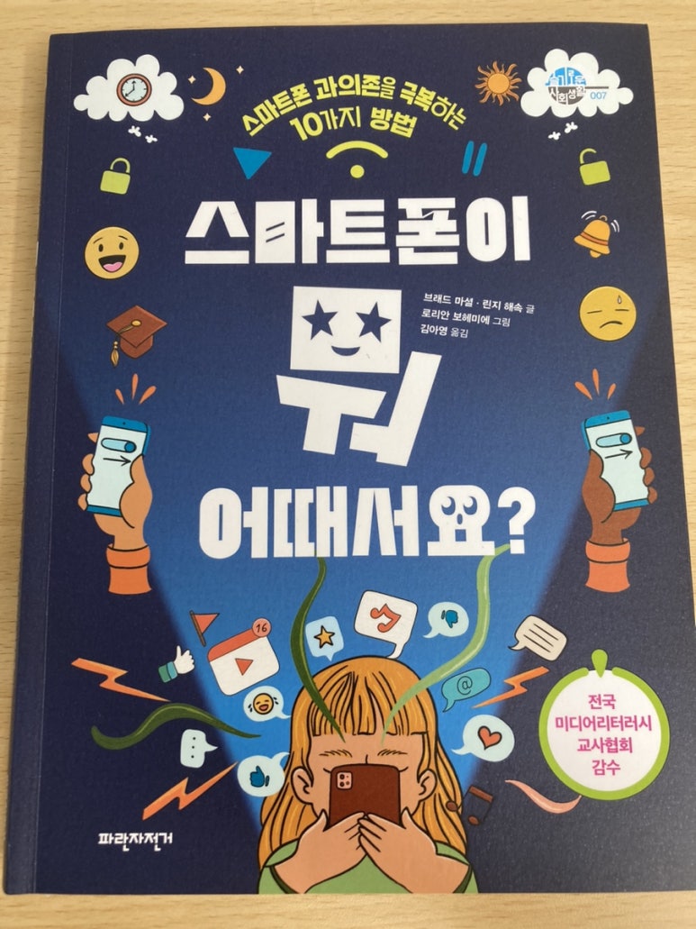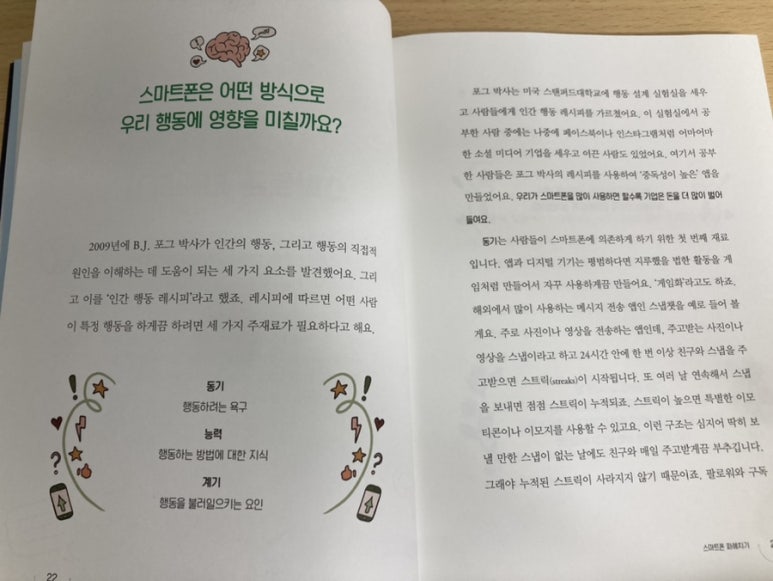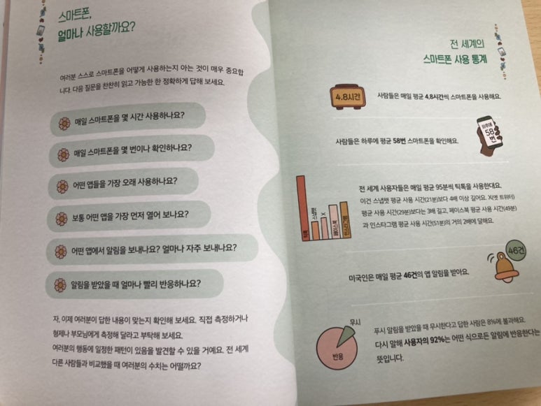 스마트폰이 뭐 어때서요?오늘은 아이들과 함께 스마트폰이 뭐 어때서요?를 읽어보았어요아이들 스마트폰 많이 보지요? 스마트폰을 달고 사는 아이들 때문에읽어봤는데요. 현명하게 스마트폰을 관리하며 살아가는 법을 배웠어요디지털 세상에 살고 있는 우리 아이들.. 스마트폰과 때려야 땔 수 없는세상인데요. 이제 우리가 이 책을 읽고 좀 더 지혜롭게 스마트폰과 살아가는 법을 배워봅시다차례를 보시면 스마트폰이 왜 문제인지부터 시작해서 즐거움을 위한틈 만들기까지 다양한 부분을 두루 읽어보실 수 있어요스마트폰 자체는 잘못이 없어요!그런데 우리는 어느 순간 스마트폰이 손에 없으면 초조하고배터리가 없으면 불안하기까지 하지요실제로 저도 배터리가 부족하면 뭔가 초조해져서 얼마 전보조 빼떠리까지 두 개나 사는 내 모습에서 나도 정말 많이 스마트폰에의지하는구나 싶었습니다~ 그러니 아이들은 더 하겠지요!스마트폰과 건전한 관계를 맺고 똑똑하고 현명하게 사용하는이야기들이 가득 담겨있어요!우리는 왜 이렇게 스마트폰을 내려놓기가 어려울까요?스마트폰이 꼭 나쁜 것만은 아닌데요! 잘만 사용하다면 새로운 정보를 찾을 수 있는 유용한 도구라고 합니다. 하지만 잘못 사용한다면집중력과 수면에 부정적인 영향을 미친다고 해요 스마트폰이 우리 삶에 어떤 영향을 줄까요?무엇보다 우리가 스마트폰을 많이 사용할수록 기업은 돈을 더 많이 번다고 해요! 동기는 사람들이 스마트폰에 의존하게 하기 위한 첫 번째 자료라고해요! 앱과 디지털 기기는 평범하다면 지루했을 법한 활동을 게임처럼만들어서 자꾸 사용하게끔 만든다고 합니다정말 놀랍지요? 실제로 저희 딸도 유튜브를 시작한 하고나서 골드 버튼을 꼭 받는 게 목표라는데요...앱 기업과 개발자는 스마트폰 앱이 여러 번의 반응을 통제하게끔 만들었다고 하니어찌 보면 무섭기도 하지만 그래도 자꾸만 사용하게 되는거 같아요스마트폰 사용시간도 정말 놀랍네요스마트폰 사용시간이 얼마나 될지 아이와 함께 점검해 보세요매일 사람들이 평균 4.8시간씩 스마트폰을 사용한다니 깜짝 놀랐습니다. 사실 핸드폰을 붙잡고 있으면 30분 한 것 같은 도 한두 시간훅 가있는 걸 느낄 때가 있거든요이제 여러분이 스마트폰에 과의존인지 체크하고 점검해 보세요저랑 아이가 체크했을 때는 2개 정도 해당되네요체크하시고 여러 가지 상황 중 하나라도 해당된다면 이제 스마트폰과의 관계를 점검해야 한다고 합니다그러면서 스마트폰과 더 나은 관계를 맺는 방법도 자세히 알려줍니다무엇보다 알람 끄기는 정말 좋은 아이디어지요저 같은 경우는 카톡은 거의 안 하는데요. 알람이 와도 꺼두면쉽게 사용하지도 않고 연락을 못 하게 된다면 결국 문자로 하게 되더군요알람을 꺼두기 잊지 마세요!스마트폰 사용에 관한 것 뿐만이아니라 감정 이해하기 까지 폭넓게 내 마음을 들여다 볼수 있어서 좋았어요감정이 어디에서 오는지 왜 그 감정을 느끼는지과학적으로 설명을 해줍니다그리고 모든 감정이 나쁜 것만은 아니라고 아이들이 배워요힘겨운 감정조차도 내 감정의 일부니깐요그러나 우리가 당분에 중독되듯이안 좋은 감정이 생길 때 스마트폰을 찾는 것은 오히려감정을 회피하거나 무디게 만들 수 있다고 합니다정말 주의해야겠지요?이제 내 감정을 어떻게 다루는지 차근차근 따라 해봅니다특히나 아이들은 감정을 잘 다스리기도 어려운데요이렇게 하나하나 실천하다 보면 조금은 내 감정을 이해하고마음을 챙기는데 큰 도움이 될 것 같아요그리고 끝으로 성공을 위해 전원을 끄기현명하게 디지털 기기를 사용하는 원칙을 알아가요!무엇보다 전원을 꺼두세요!라는 말이 기억에 남네요디지털 기기 사용하는 규칙을 정하고 이제 노력해야겠습니다또 아이들에게 가장 중요한 푹 잠자기 방법도 알아갑니다무엇보다 스마트폰이 울리거나 하면 잠들기 어렵죠실제로 우리 아이도 자기 전에 알림이 오면 핸드폰 확인하기 바빠서 잠을 쉽게 못 든 적이 있었는데요~이제 잠자리에 들 때도 이 책의 도움을 받아 하나씩 실천해 봅니다마지막으로 즐거움에 대해서 알아가요!나는 즐거울 준비가 얼마나 되었나요?스마트폰보다 훨씬 더 즐거운 일을 찾아가는 여정이 중요하겠지요?스마트폰에 대해서 많이 알아가고 스마트폰 늪에서 빠져나와 내 감정을 다스리고,새로운 습관도 만들고, 푹 자고, 일상 속 즐거움을준비하기 위해서 이 책을 꼭 읽어보시기를 추천드립니다"출판사로부터 도서 협찬을 받고 본인의 주관적 견해에 의해 작성하였습니다