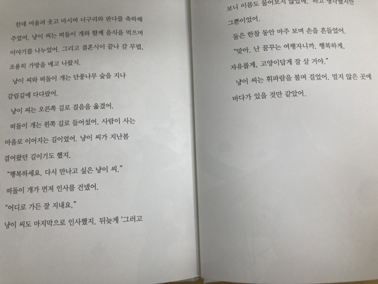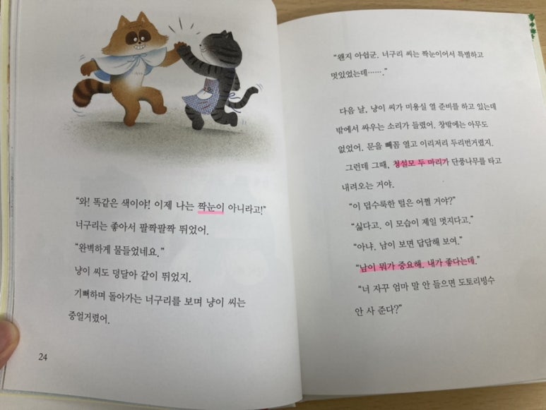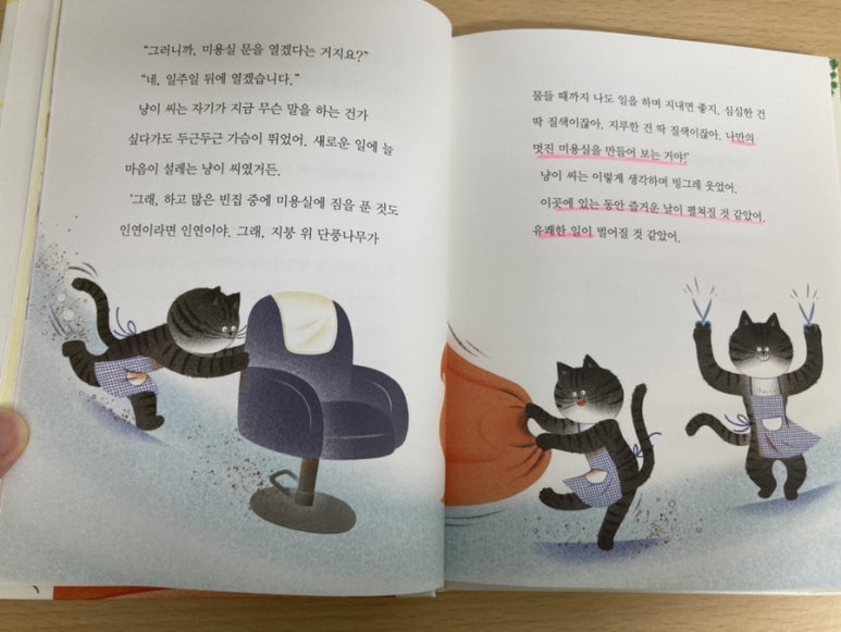 오늘은 아이들과 함께 냥이 씨의 유쾌한 미용실을 읽어봤어요발길 닿는 대로 여행을 떠나는 냥이 씨캐릭터가 무진장 귀엽지요~냥이 씨가 걸음을 멈추고 찾은 곳은 낡은 집이었는데요빈집을 청소하던 중 만나게 된 건 너구리였어요미용실로 사용됐던 낡은 집이기에 동물들이 찾아오는 거 같지요?원래 집주인은 이오순 할머니 집이었답니다이제 냥이 씨의 자신만의 미용실을 만들기로 해요 냥이 씨는 이오순 할머니가 남기고 간 <한번 읽고 익히는 미용실습>이라는책에서 염색하는 법도 찾고 이제 미용실을 열기 위해 준비를 해요문을 열자마자 찾아온 손님은 너구리에요너구리는 본인의 눈이 짝눈이라 똑같이 염색하러 온 건데요냥이 씨는 그런 너구리에게너구리의 짝눈이 특별하고 멋지다고 이야기해 주고 싶었지만손님의 뜻에 따라 염색을 해줍니다좋아하는 여자에게 잘 보이고 싶은 너구리 씨이제 만족할까요???냥이 씨는 너구리씨의 짝눈이 특별했는데 ...안타까워하는군요~냥이 씨는 많은 동물들을 만나면서 각자 그들만의 사연과 요구에 따라 머리 스타일을 바꿔줍니다특히나 몸이 뚱뚱해서 털을 자르러 온 판다에게"아뇨, 제가 보기엔 아주 멋져요"라며 위로를 해줍니다하지만 동물들은 그 말을 듣지 않아요다들 원하는 모습대로 만들어주지요손님이 이제 줄을 지어 기다리네요~냥이 씨의 긍정적이고 유쾌한 면이 어쩌면 살면서 필요한것 같아요!!특히나 겉모습이 바꾼다고 친구가 생기는 건 아니라고 조언을 해주는 부분이감동적이었어요우리는 때론 친구를 만나기 위해 혹은 남자친구 여자친구에게 잘 보이기 위해내 특별함까지 없애가면서 잘 보이길 원하지요냥이 씨를 통해 내 모습 그대로도 충분히 멋지고특별하다는 걸 느끼고 가요!냥이 씨의 미용실을 통해서 외로운 동물들이 서로 친구를 만나가는 과정이 보기 좋았어요그러던 중 너구리의 사연이 나오는데요이제 너구리 씨는 좋아하는 동물과 잘 이어진 걸까요?뒷이야기가 정말 궁금해지네요~냥이씨가 "행복하세요! 라고 우리에게 말해주는듯합니다!어려 분도 이 책을 읽고 이제 자신의 모습에 자신감을 갖고나도 충분히 특별하고 멋지다는 걸 깨달아요그리고 행복하고, 자유롭게 나답게 살아가는 법을 알아가요~유쾌한 미용실을 뒤로하고 어디론가 떠나는 냥이 씨의다음 모험이 기다려집니다
