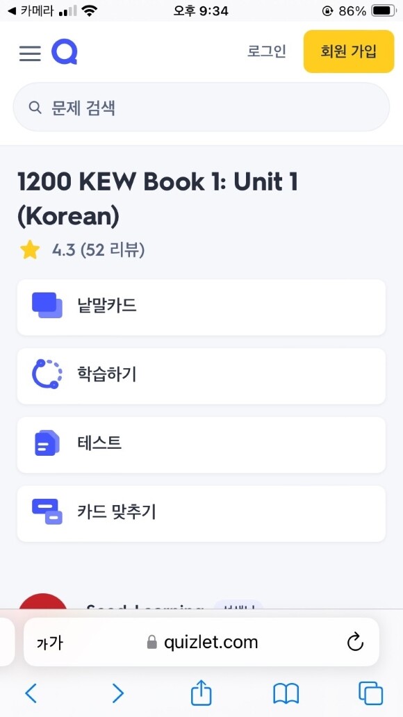 또한 Quizlet을 클릭하시면 낱말 공부, 학습하기, 테스트, 카드 맞추기