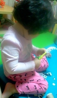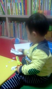 열심히 눈스티커를 자르고 있는 아이들, 지우는 제법 눈 모양을 오려내지만, 3살 민준이에게는 가위를 들고 있는