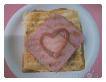 6. 식빵위에 2의 달걀부침, 4의 햄을 올리고 토마토케쳡을 뿌린다.