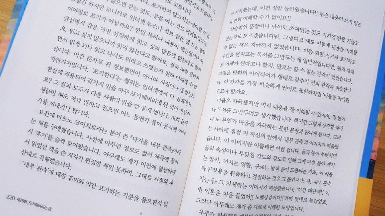 우선 저자가 치열하게 열심히 걸어왔다는 것을 알았고, 그로 인해 저자의 글을 읽어내려 갈 때마다 나 자신이 대충 내린 선택에 대해 반성과 후회를 해야 했다. 물론, 이미 떠나버린 시간들이라서 후회해봤자 소용없지만 말이다. 내가 생각했던 책과 조금 거리가 멀었지만, 그래도 시간을 허비한 느낌이 안 들어서 좋았다.