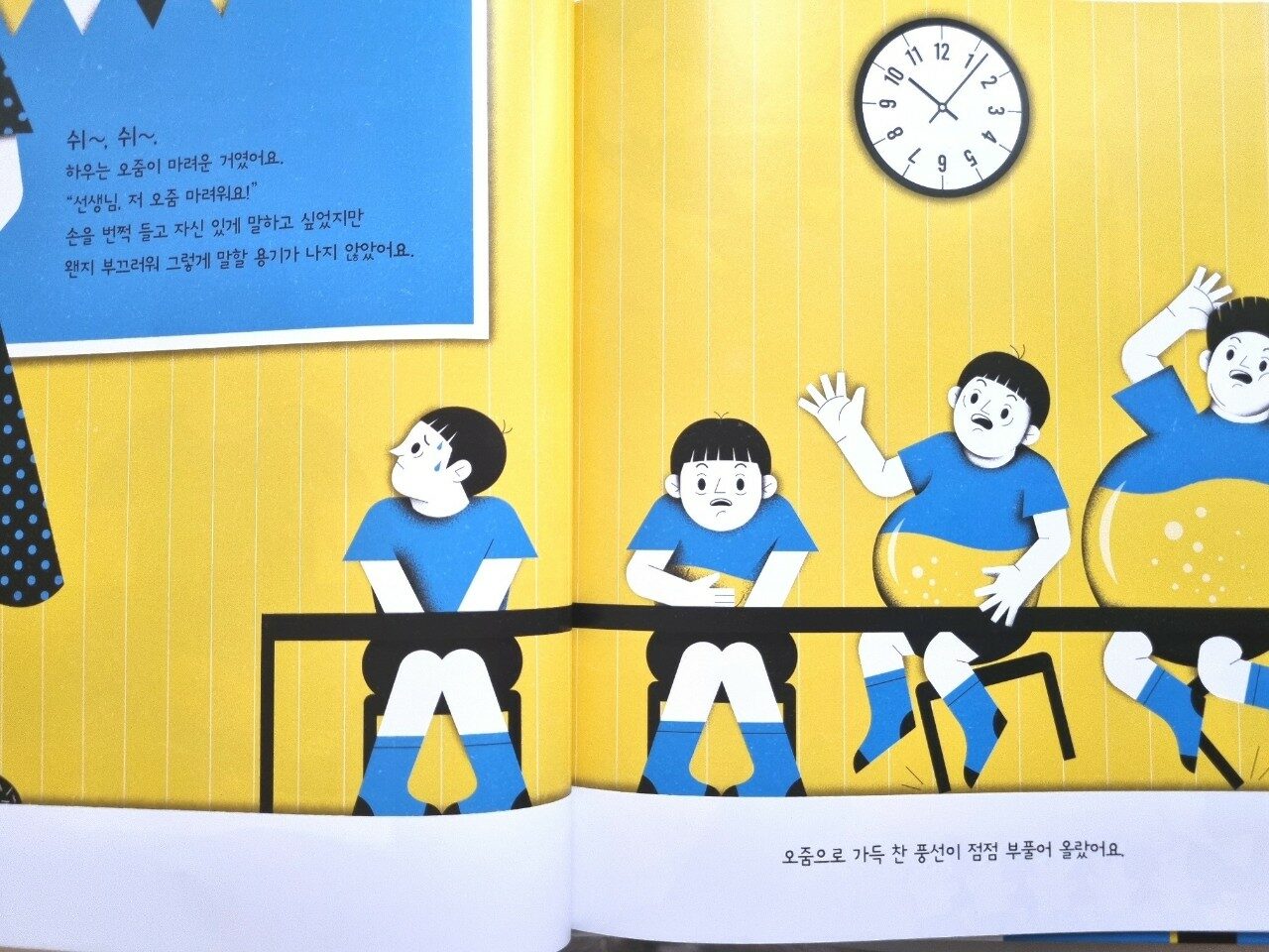 수업 시간, 오줌이 마려운 주인공 하우가 부끄러워서 말을 못 하고 계속 참고 있어요. 오줌으로 가득 찬 배가 풍선처럼 점점 부풀어 올랐어요. 오줌배를 풍선으로 표현했네요.