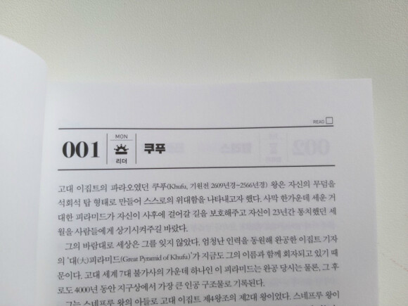 365일동안 다 읽고 나서 중간중간 문득 찾아보고 싶은 인물이 생기면 찾아보며 또 다시금 읽어볼수 있는 역사속인물 사전같은 책이지 않나 싶다.