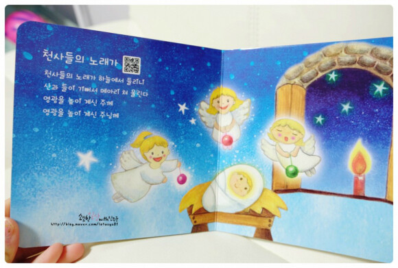 5개의 찬양캐럴곡이 귀여운 그림들과 함께 가사가 적혀있어요.