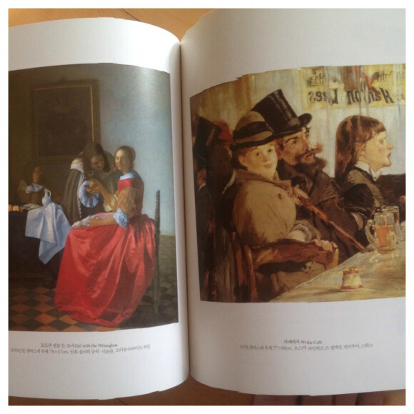 <포도주 잔을 든 소녀>는 관람자를 의식한 듯한 연극의 한 장면처럼 보이는 17세기 일반 가정의 한 장면이라며 <카페에서> 19세기 카페의 황금기였던 파리의 도심의 카페 한 장면을 보여준다.