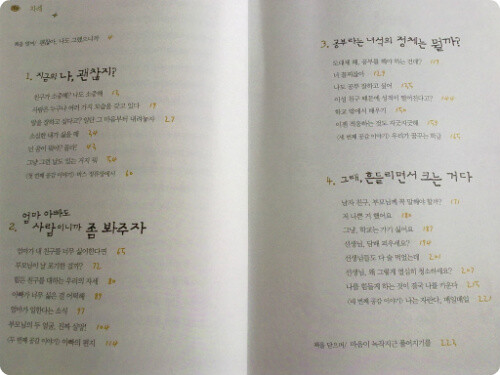 이 책에는 대한민국 보통아이들이 고민하는 내용들이 나온다. 친구에 대한 문제, 부모도 나와 같은 평범한 인간이라는 사실에 실망하기도 하면서 부모를 객곽적으로 바라보기하고 모든 아이들이 관심사인 공부의정체와 이성문제, 어려운 환경에 처한 친구들의 다양한 사례들이 등장하는데 저자가 동기부여 강사라하고 해서 모두 가능하다거나 자기식의 설교가 아닌 들어주고 이해해주면서도 무작정 받아주지않는다.