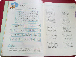 수배열표란 배우고자 하는 수의 주변수를 관찰하여 추측해서 푸는 방식인데 처음에는 수배열표가 한줄이였다면 다음에는 두줄 그다음에 세줄씩 복잡한 메트리스구조로 확장된다. 그림 04처럼 두줄배열표를 보면 첫번째와 두번째는 10씩 차이가 나는데 아이가 잘 관찰할 수 있어야 비어있는 문제를 풀 수 있다.